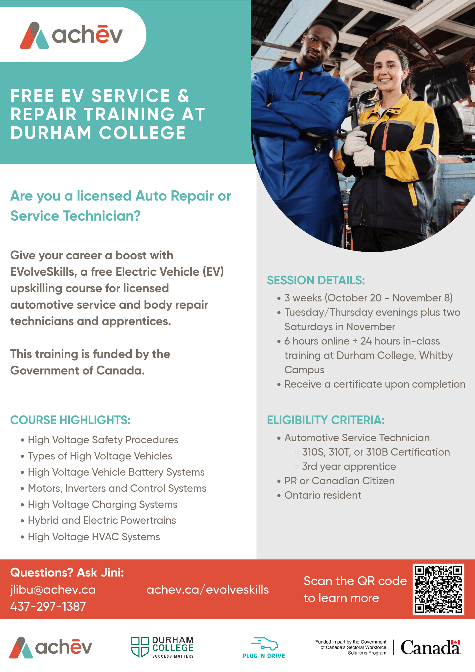 Give your career a boost with EVolveSkills, a free Electric Vehicle (EV) upskilling course for licensed automotive service and body repair technicians and apprentices. This training is funded by the Government of Canada.